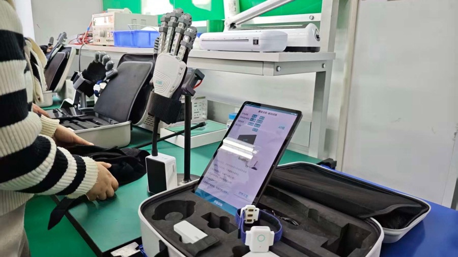 在位于普陀桃浦的上海海每康智能医疗科技有限公司研发基地,记者看到,这款手部外骨骼设备尺寸与普通手套相近,患者穿戴弹力辅助装置后即可使用。其核心的神经接口驱动模块由企业自主研发,通过固定在小臂上的采集装置,可精准捕捉使用者的肌电信号。